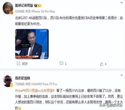 媒體人“劉驍”發(fā)文點評:“看了一場四川VS北京,最終四川輸了51分,沒有外援,加上賽季前的變故,這支球隊能站在賽場上已經(jīng)非常不容易了。然而,更讓人感動的是四川球迷,球隊這個狀況,還能有那么多人去現(xiàn)場支持,值得一個大大的點贊”。