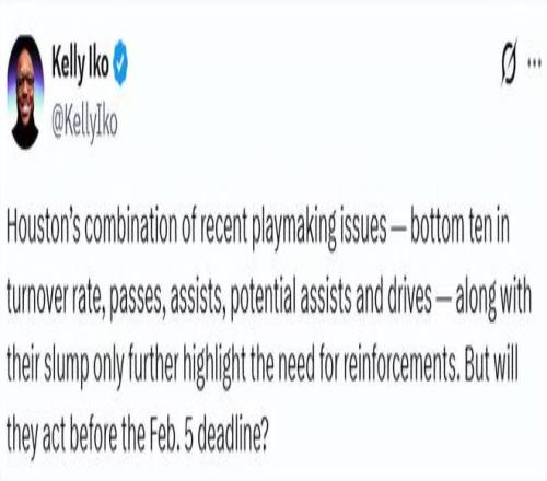 值得一提的是,火箭隊管理層并未像前幾個賽季那樣,釋放出積極補強陣容的信號,反而認為球隊目前的低迷是可控的,選擇按兵不動。